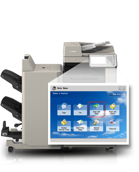 - Set the original on the platen glass or feeder and tap [Scan and Send] in the [Main Menu] of the Canon device