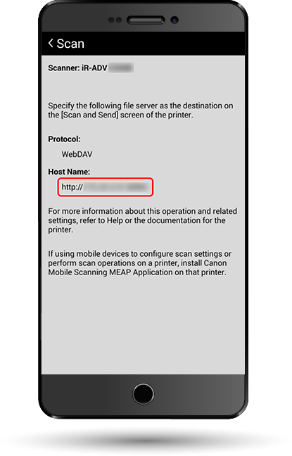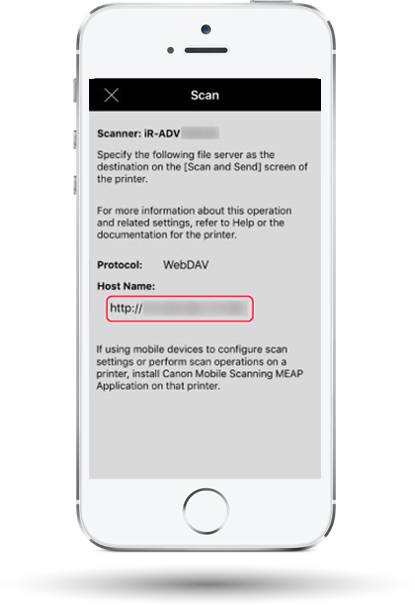 - Select [WebDAV] for the [Protocol] field and enter [Host Name] displayed in the [Scan] screen of the app