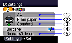 <5> Date/file no.: You can print the date the photo was taken / file numbers (DCF numbers) on photos.
