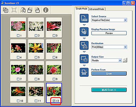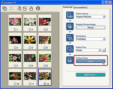 - To scan monochrome films, mounted negative slides and 120 format films, start ScanGear CS from an application program and use the Advanced Mode to scan.