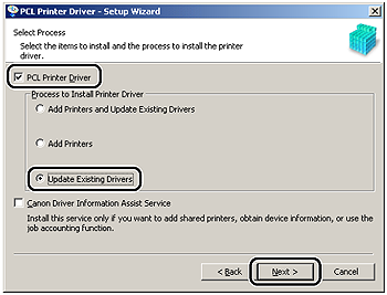 2. Select [PCL Printer Driver], [PS3 Printer Driver], or [UFR II Printer Driver] > select [Update Existing Drivers] > click [Next].
