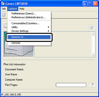 For details on starting the Remote UI by entering the IP address of the printer in a web browser, see "User's Guide" (HTML manual) in the CD-ROM supplied with the printer.