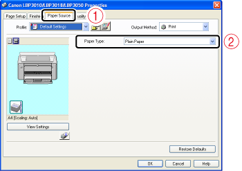 8. Display the [Paper Source] sheet (1), then select the type of the loaded paper in [Paper Type] (2).