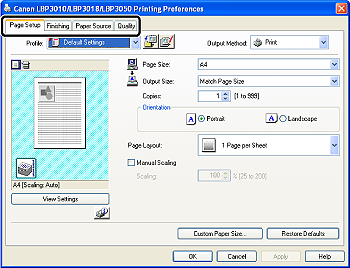 3. Specify the default value for printing preferences in the [Page Setup], [Finishing], [Paper Source], and [Quality] sheets.