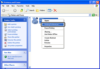 2. Right-click the icon for this printer, then select [Printing Preferences] from the pop-up menu.