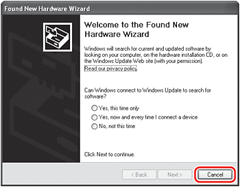 If you see the Found New Hardware Wizard, remove the USB cable. Click Cancel to quit the screen. Next, turn off the machine. Then proceed from step c to install the MP Drivers.