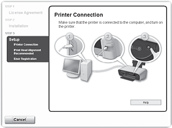7. When the Printer Connection screen appears, connect one end of the USB cable to the computer, the other to the machine, then TURN THE MACHINE ON. The software will begin identifying the printer port being used.