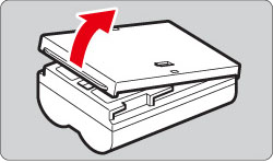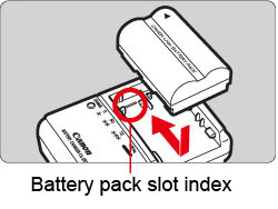 - Align the battery's front edge with the battery charger's index line. While pressing down the battery, slide it in the direction of the arrow.