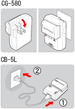 As shown by the arrow, flip out the battery charger's prongs and insert the prongs into a power outlet.