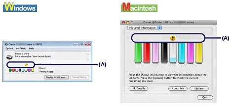 You can confirm the status of each ink tank with the printer status monitor (Windows) or the Canon IJ Printer Utility (Macintosh).