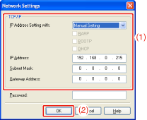 - [Manual Setting]: Allows you to set the IP address directly. The IP address entered in [IP Address] is set for the printer.