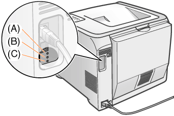 5. Make sure that the LNK indicator (B) on the printer's network board is on.