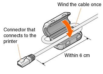 Attach the ferrite core at 6 cm or less from the end of the connector connected to the printer.