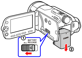 To prevent the battery pack from dropping due to faulty operation, it is firmly fixed to the camcorder. When removing the battery pack, slide the < BATTERY RELEASE > switch and hold it firmly in the direction indicated by the arrow.