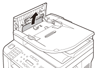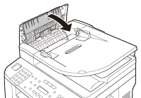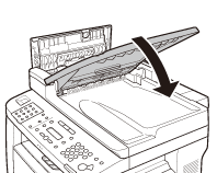 When <CHECK DOCUMENT>, <FEEDER PAPER JAM/CHECK THE FEEDER> or <DOCUMENT TOO LONG> appears on the display, remove a jammed document from the ADF.