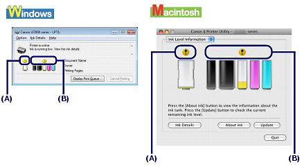 You can confirm the status of each ink tank with the printer status monitor (Windows) or the Canon IJ Printer Utility (Macintosh).