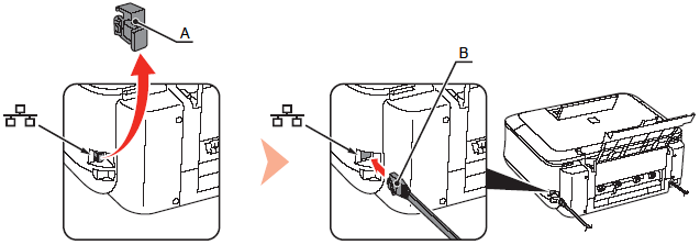 1. Remove the Cap (A), then connect a network device (router, etc.) with a Ethernet cable (B).