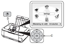 2. Use the Easy-Scroll Wheel (C) to select Settings, then press the OK button.