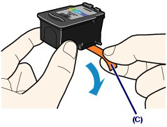 (1) Take a new FINE Cartridge out of its package and remove the orange protective tape (C) gently.