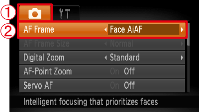 ), [AF Frame] will automatically be set to [Face AiAF]; therefore, it is not required to perform the following procedures. - If a face is not detected and only gray frames (no white frame) appear, the setting will change to [AiAF]. (From the nine AF frames, an [AF Frame] will be automatically selected to bring the image into focus.)