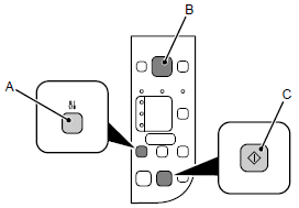 Press the Maintenance button (A) 11 times. When the LED (B) lights up as shown in the illustration above, press the Color button (C).