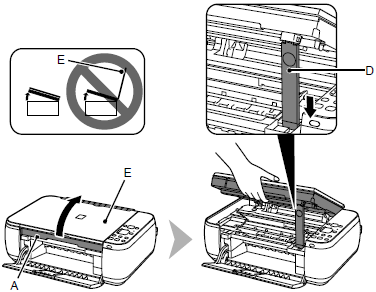 Lift the Scanning Unit (Cover) (A) and fix it with the Scanning Unit Support (D).