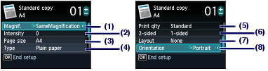 - This copy menu can be used in combination with Two-sided copy. If you use this copy menu in combination, you can copy eight original pages on one sheet of paper. In this case, four original pages are copied on each side of paper. When you use this copy menu in combination, select 2-sided in 2-sided on the print settings screen. As the Document setting screen is displayed after scanning the fourth sheet of original is complete, follow the on-screen instructions to scan the other sheet of original. For details on Two-sided copy, refer to [ Copying onto Both Sides of the Paper (Two-sided copy) ].