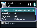Press the right Function button to select Print settings on the copy standby screen. You can select the item, such as page size, media type, or print quality, and change the setting.