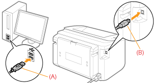 - Square end (B): Connects to the USB connector on this printer.