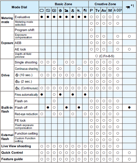 Function Availability Table According to Shooting Modes (EOS REBEL T3/EOS 1100D)