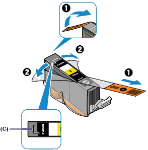 (1) Take a new ink tank out of its package, remove the orange tape (
