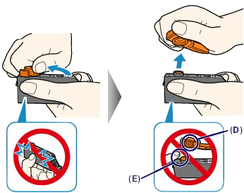 - Do not touch the inside of the orange protective cap (D) or the open ink port (E). The ink may stain your hands if you touch them.
