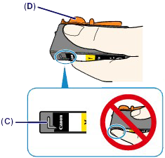 (2) Hold the ink tank with the orange protective cap (D) pointing up while being careful not to block the L-shape air hole (C).