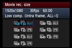 9. Turn the <Quick Control Dial> to select select the recording size, then press the <SET> button.