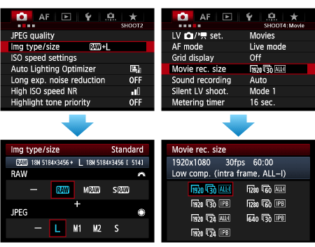 ] tab, press the <SET> button, and then select the image quality from the screen that appears. - For movies, select [Movie rec. size] from the [