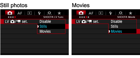 6. Turn the <Quick Control Dial> to select [Stills] or [Movies], and then press the <SET> button.