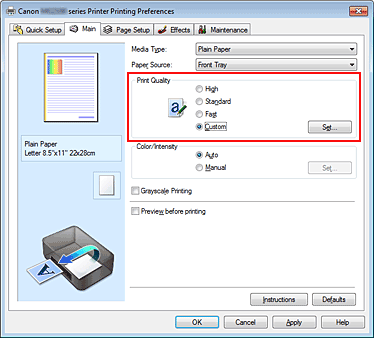 2. Select Custom for Print Quality on the Main tab, and click Set....
