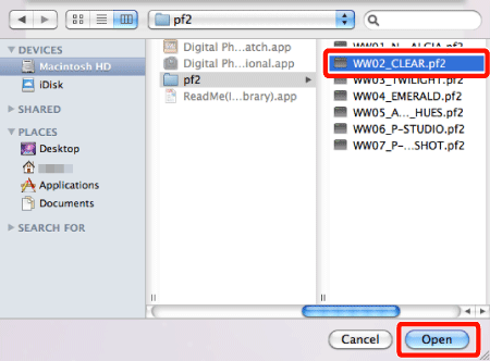 8. In the [Open] dialog box that appears, select the Picture Style file (with the ".pf2" extension) saved in the PC and click [Open].