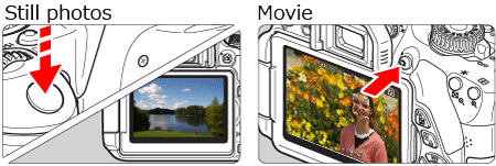 Please note that some shooting procedures differ between still photos and movies. To shoot still photos, please refer to the instructions for still photos, and to shoot movies, please refer to the instructions for movies.
