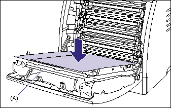 e. Do not place any object on or touch the transfer belt (A) of the ETB unit. The transfer belt of the ETB unit is supplied with a function that cleans itself, therefore, do not clean the belt even when the toner is on it. If the ETB unit is broken or transfer belt is damaged, this may result in misfeeds or deterioration in print quality.