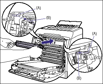 Align (A) of the toner cartridge that you want to replace with the slots (B) to which the label of the same color is attached, then insert the cartridge until it stops.