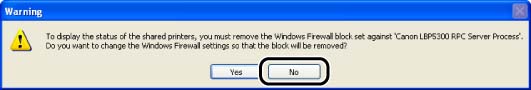 d. If you are using Windows XP Service Pack 2 or another operating system equipped with Windows Firewall on the client computers, configure Windows Firewall to unblock communication with the print server. If you do not clear the block, the printer status may not be displayed properly in the Printer Status Window, and some of the printer functions may not operate properly. For details on the procedure for configuring Windows Firewall to unblock communication with the print server, see "Configuring Windows Firewall to unblock communication with the print server" in Related Information at the end of this page.