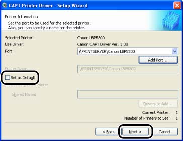 10. Select whether or not to use this printer as the default printer, then click [Next].