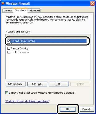 2. In the [Exceptions] sheet in the [Windows Firewall] dialog box, select the [File and Printer Sharing] check box, and then click [OK].
