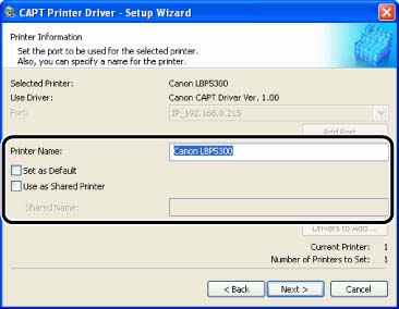 When the computer on which you are currently installing the printer driver is to be used as a print server, select the [Use as Shared Printer] check box.