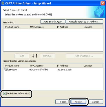 a. Depending on the system environment, "192.168.0.215" (the default value for the network board) is displayed in [IP Address] under [Printer List]. If you want to change the IP address, see "Chapter 2 Setting Up the Network Environment for Printing" in Network Guide (PDF manual) in the CD-ROM supplied with the printer to change the IP address after finishing the installation.