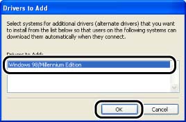- If you select the [Use as Shared Printer] check box, and if there is any computer on which Windows 98/Me runs on the network, click [Drivers to Add], select [Windows 98/Millennium Edition], and then click [OK].