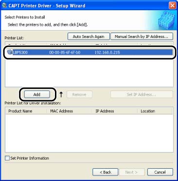 If more than one [Unknown Device] are displayed, turn off the devices other than the printer to be installed or remove the devices from the network, and then click [Auto Search Again]. After completing the settings for this printer, restore the devices to their original states.