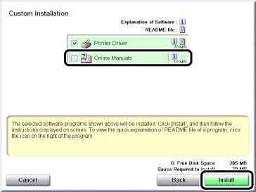 If you selected [Custom Installation] in Step 7, clear the [Online Manuals] check box, and then click [Install].