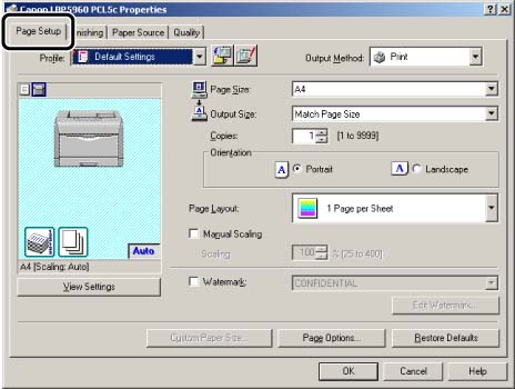 6. Display the [Page Setup] sheet and specify the paper size or page setup.